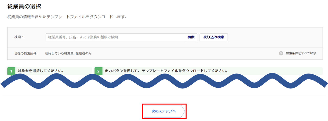 「従業員の選択」画面下部の[次のステップへ]をクリックします。