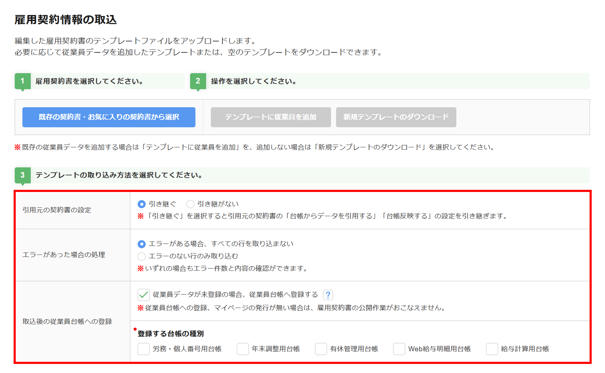 | 取込後の従業員台帳への登録 | 「従業員データが未登録の場合、従業員台帳へ登録する」にチェックをつけると、「台帳種別の選択」が表示されます。 登録をおこなう対象の「台帳種別」にチェックをつけます。 仮発行の契約書を作成するなど未登録の従業員データを従業員台帳へ登録しない場合は、 「従業員データが未登録の場合、従業員台帳へ登録する」のチェックを外します。 ※雇用契約書の公開には、従業員台帳への登録が必要となります。 |
