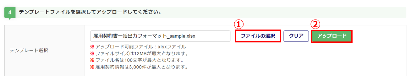 [ファイル選択](①)をクリックし、編集したテンプレートファイルを選択、[アップロード](②)をクリックします。
