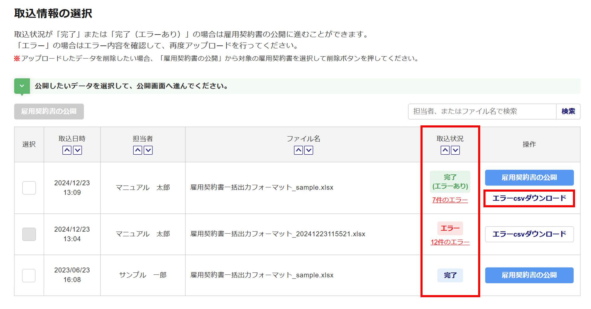 | 完了(エラーあり) | エラーが生じていない情報のみ、取り込まれています。 ※「エラーがあった場合の処理」で「エラーのない行のみ取り込む」を選択した場合に 表示されます。 |