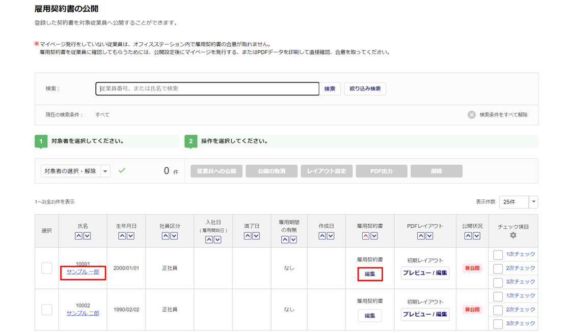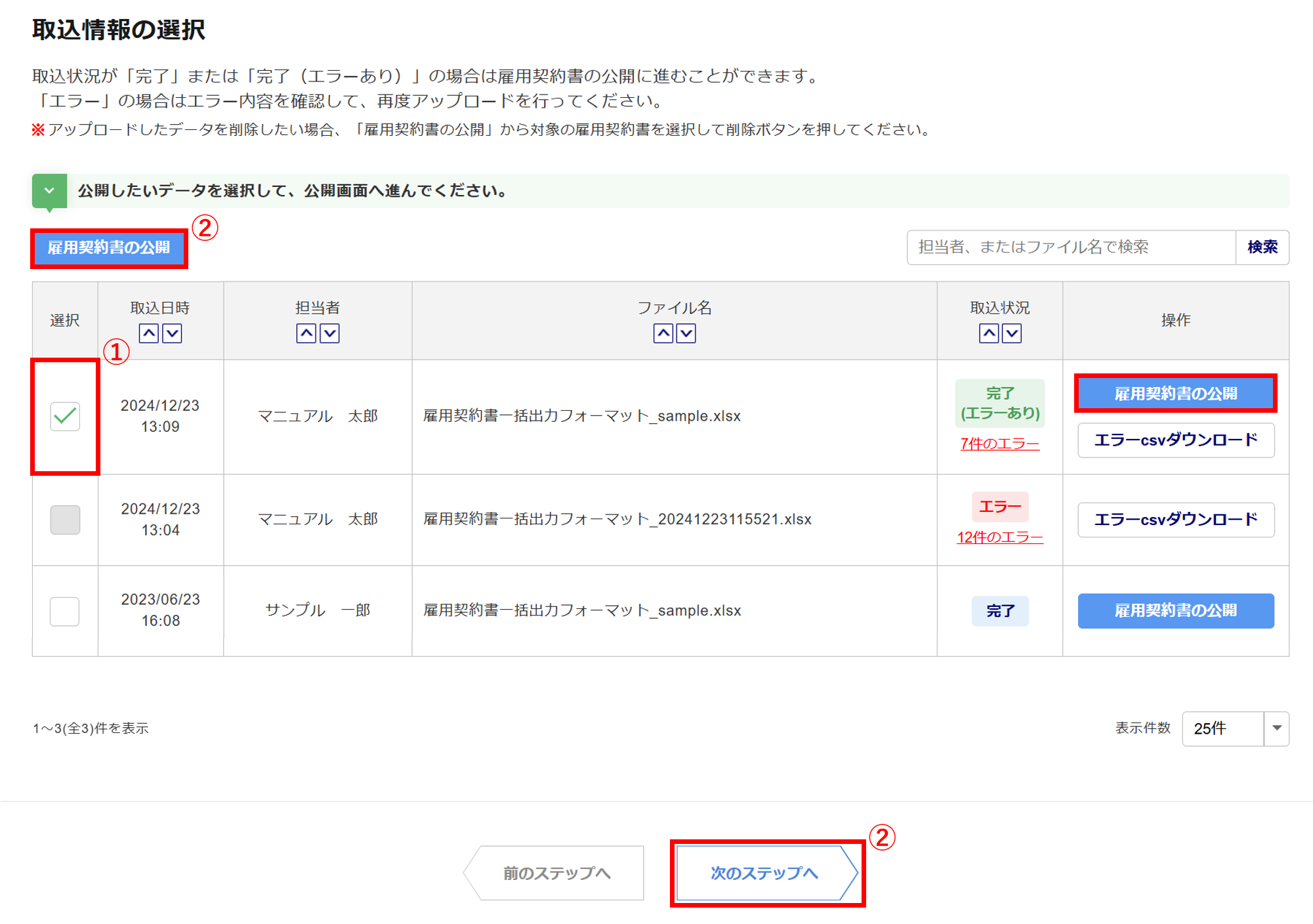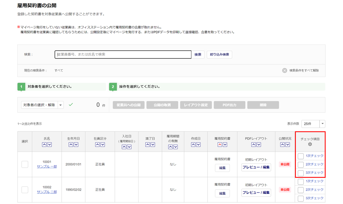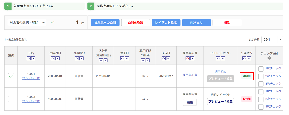 雇用契約書の公開をおこなう取込情報が複数の場合は、 対象の「選択」列(①)にチェックをつけ 、[雇用契約書の公開](②)または[次のステップへ](②)をクリックします。