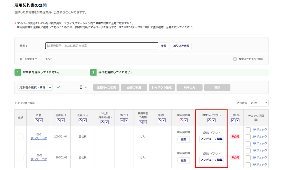 作成した雇用契約書の契約内容およびPDFレイアウト設定をおこない、従業員に公開します。
