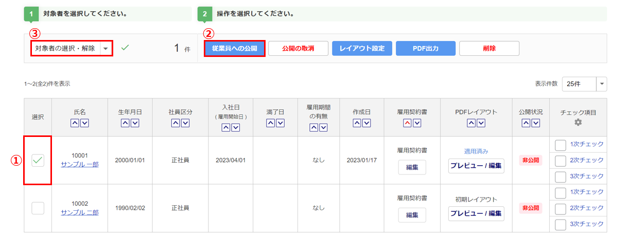 対象の雇用契約書の「選択」列(①)にチェックをつけ、[従業員への公開](②)をクリックします。