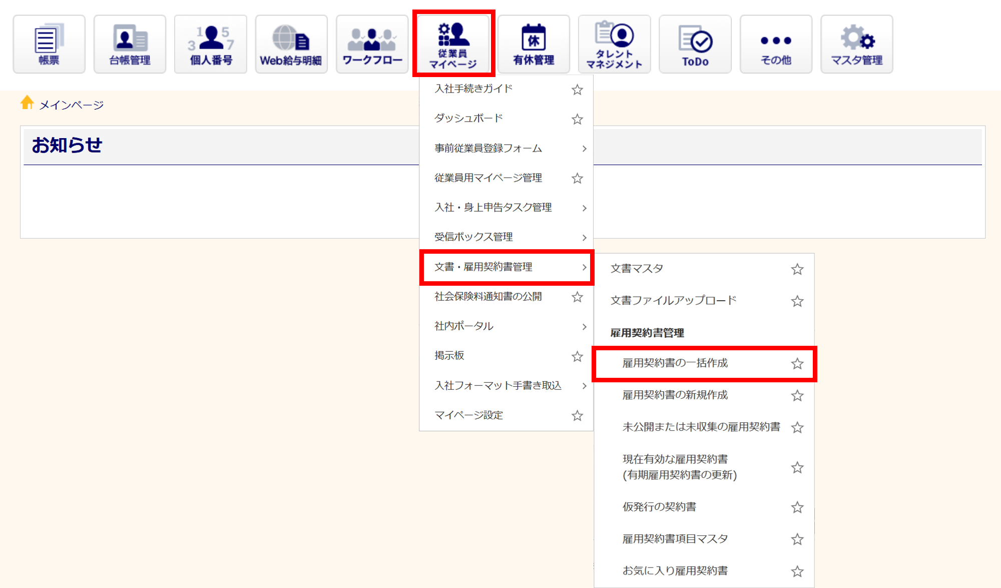 [従業員マイページ]>[文書・雇用契約書管理]>[雇用契約書の一括作成]をクリックします。