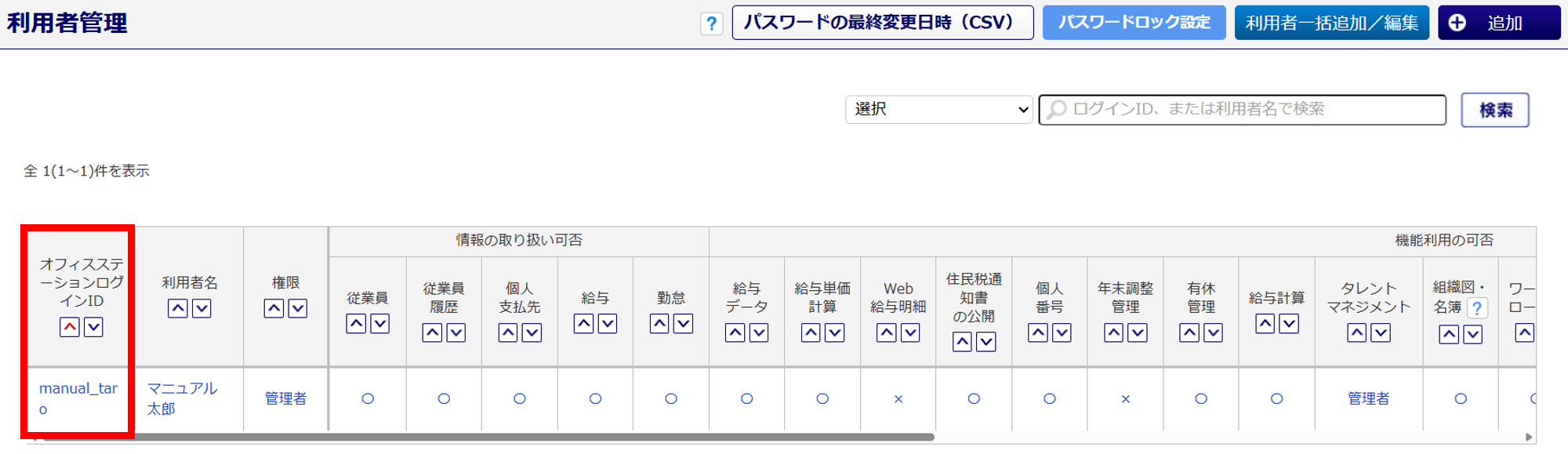 ログインパスワードが不明な場合は、管理者権限の利用者(担当者)もしくは、初期ログイン用 の情報でログインし、システム内[利用者管理]([マスタ管理])>[利用者管理]から再設定してください。