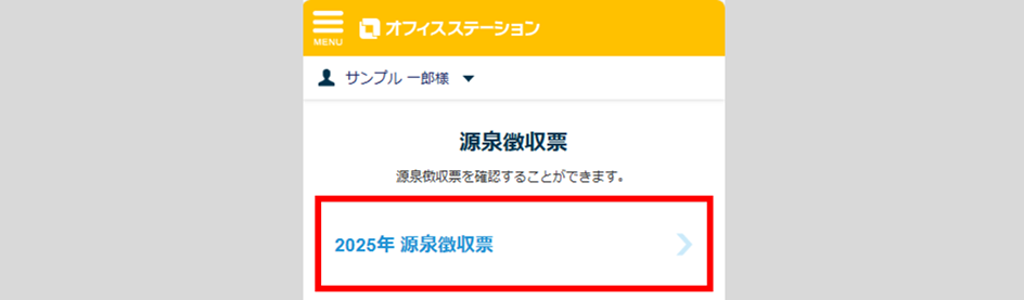 Myデータもしくは、メインページ上部[源泉徴収票]>[2025年 源泉徴収票]をクリックします。