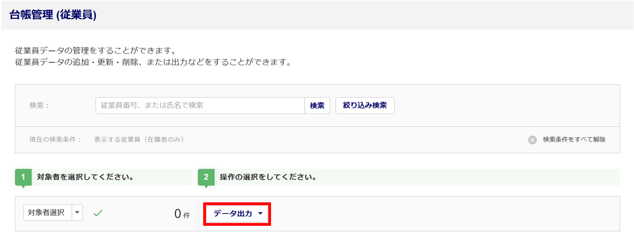 従業員台帳の基本情報に対して閲覧制限のある利用者の場合、本機能の操作はおこなえません。