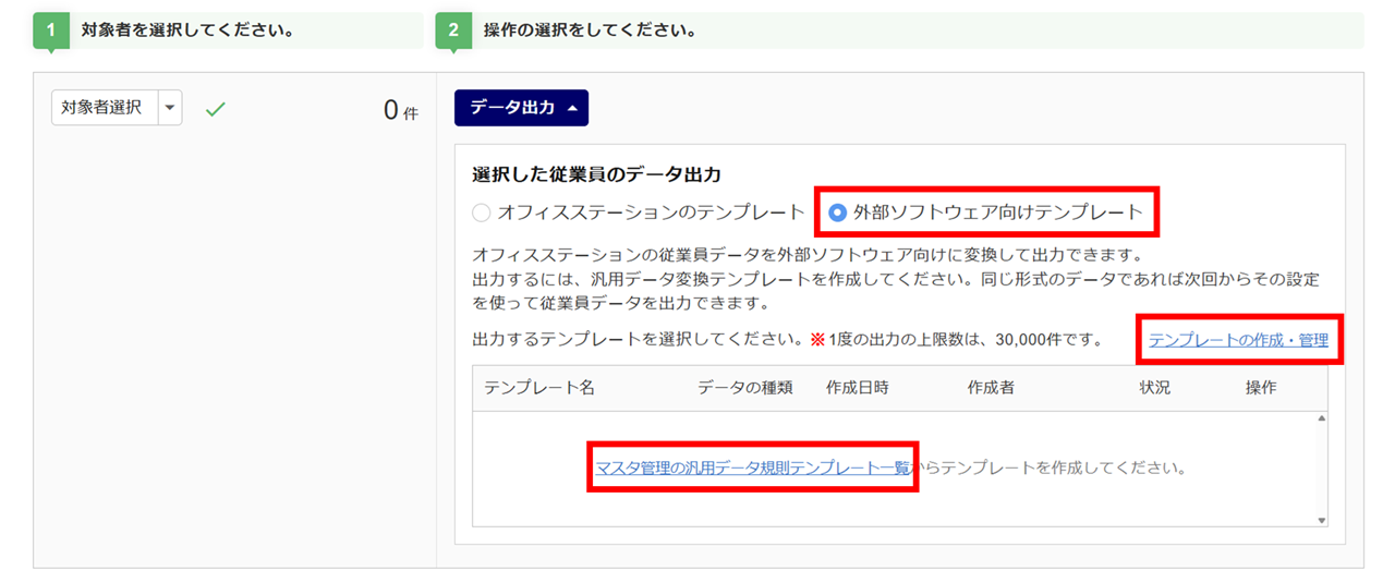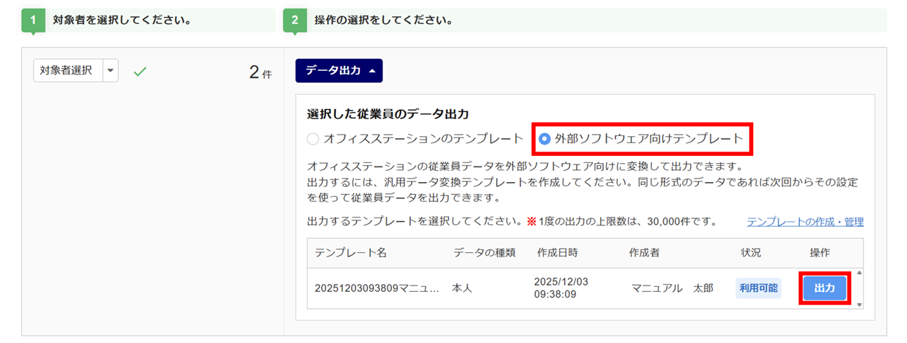 「外部ソフトウェア向けテンプレート」を選択し、使用するテンプレート「操作」列の[出力]をクリックします。