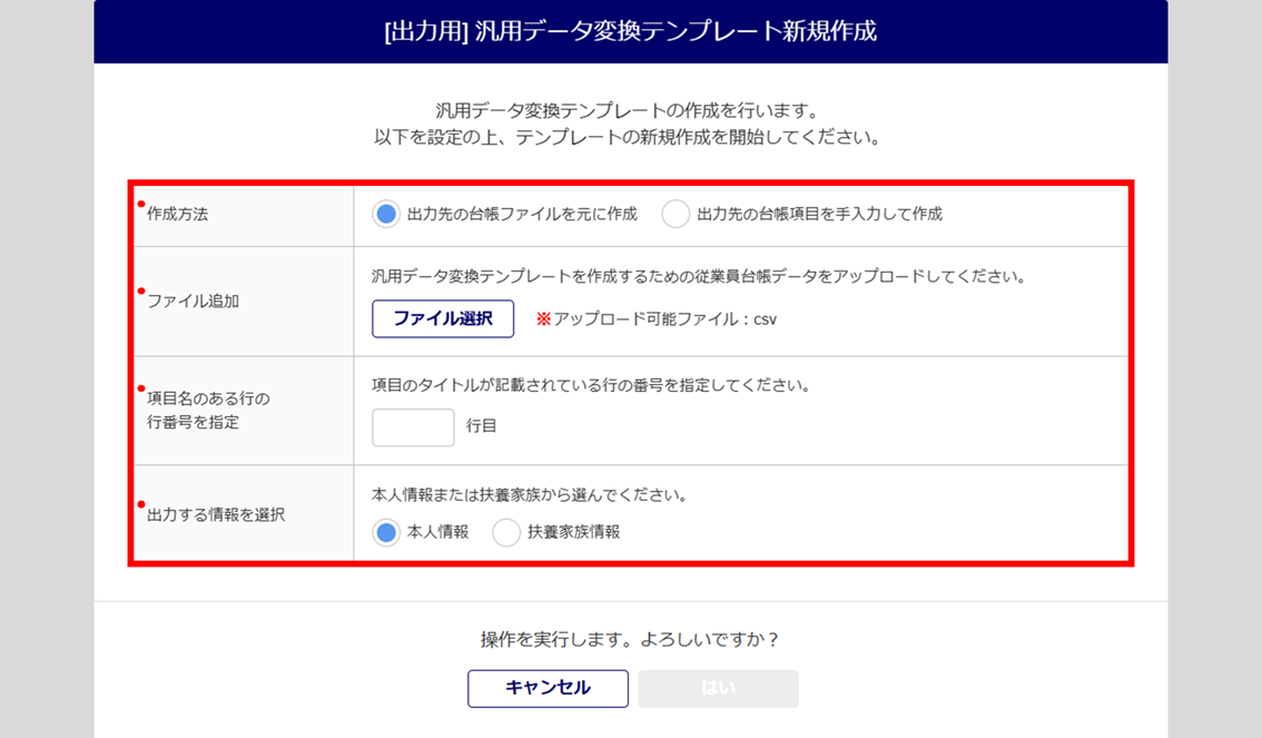 「出力先の台帳項目を手入力して作成」を選択した場合