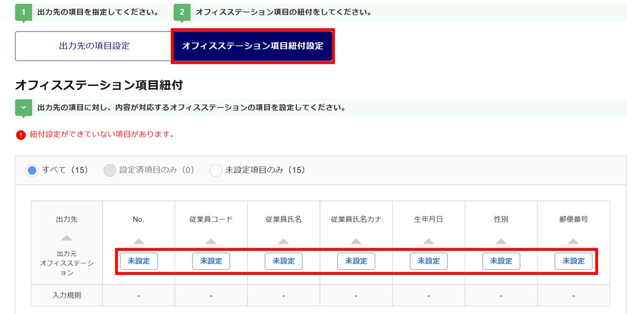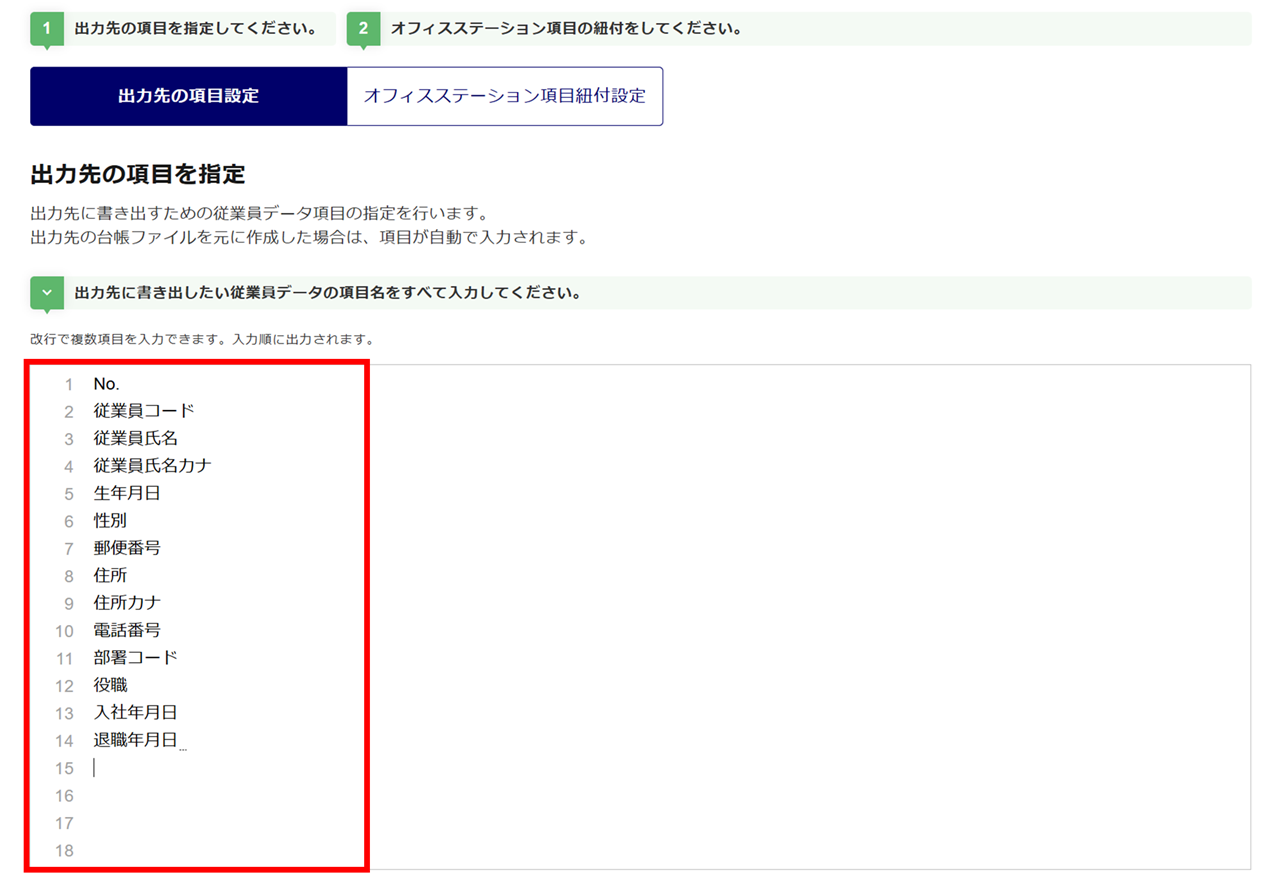 出力先の項目とオフィスステーションの項目を紐付けます。