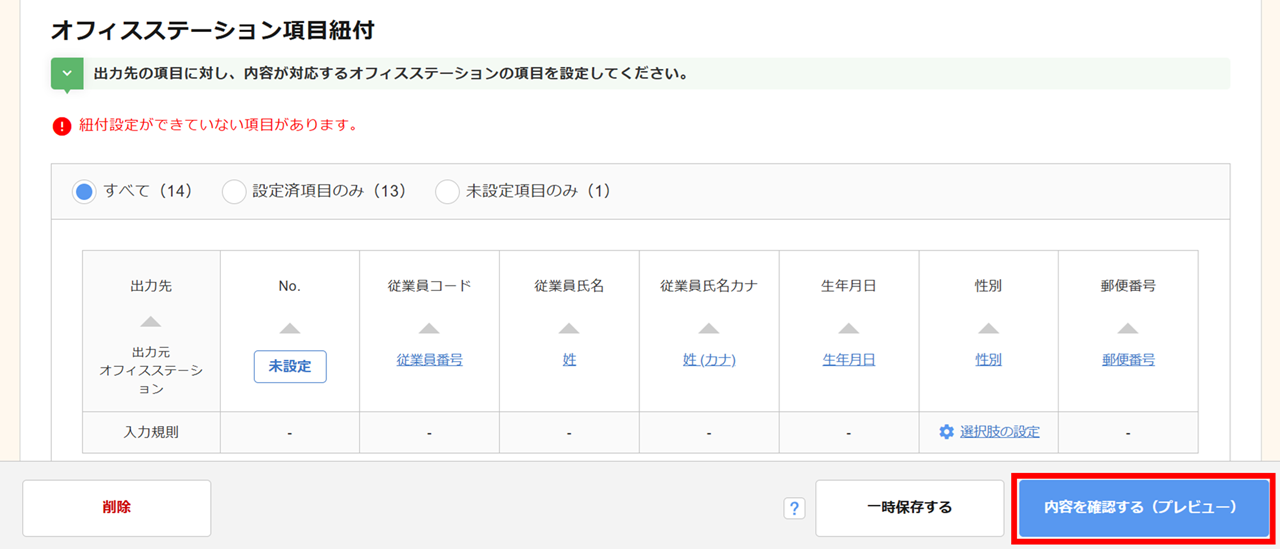 各項目の紐付け完了後、[内容を確認する(プレビュー)]をクリックします。