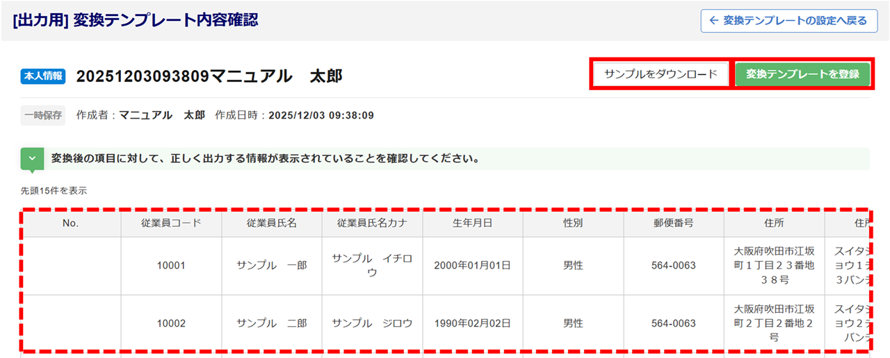 「[出力用] 変換テンプレート内容確認」画面が開きます。一覧に出力される情報が表示されます。