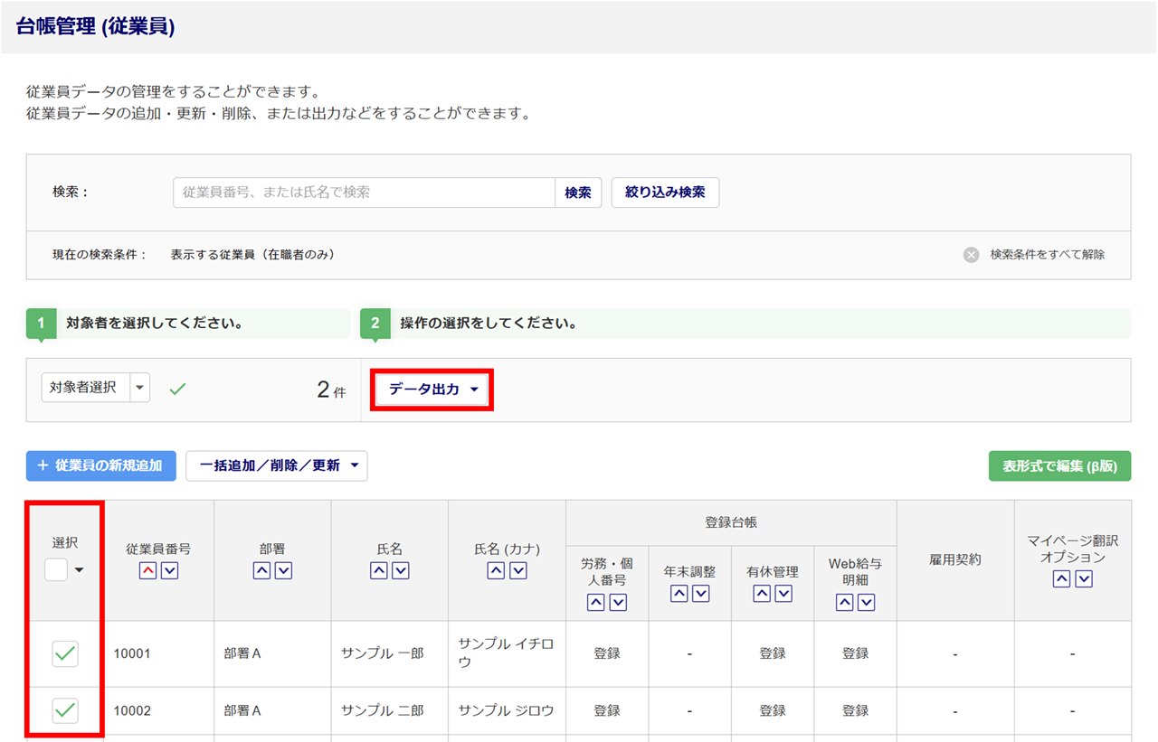 「台帳管理(従業員)」画面にて、出力する従業員を指定する場合は、出力対象の従業員の「選択」列にチェックします。