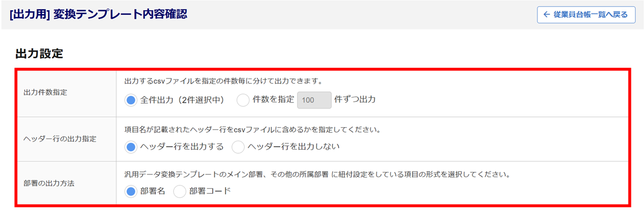 部署の出力方法 「メイン部署」と「その他の所属部署」に紐付けをおこなっている場合、項目の形式を選択します。