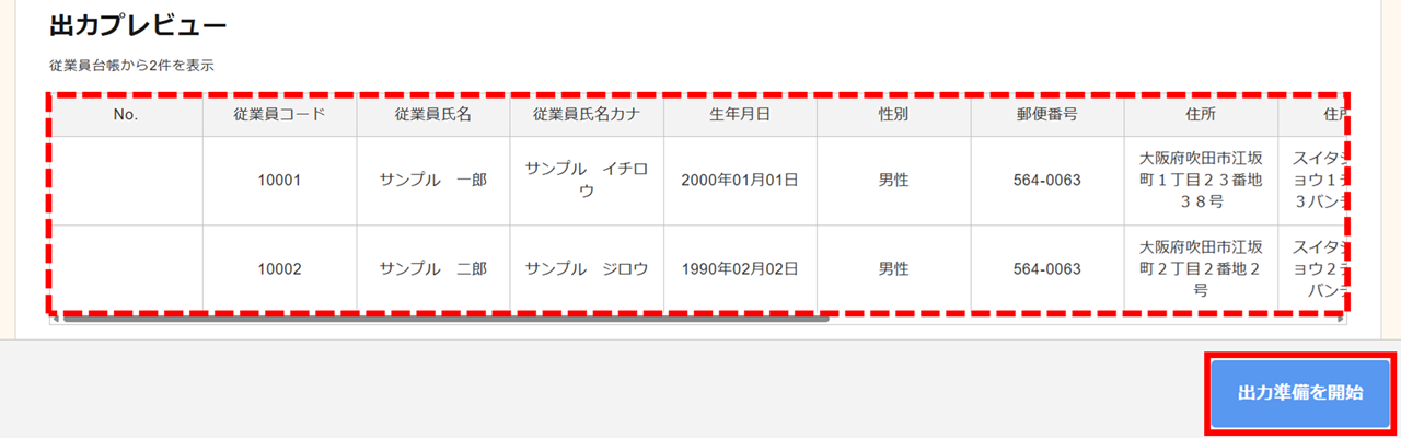 「出力プレビュー」欄で出力内容を確認し問題がなければ、[出力準備を開始]をクリックします。