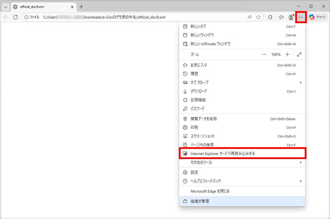 公文書を開いているページに戻り、ページを更新する(F5キーを押下するまたはページ左上の更新ボタン)と、IEモードで表示されます。
