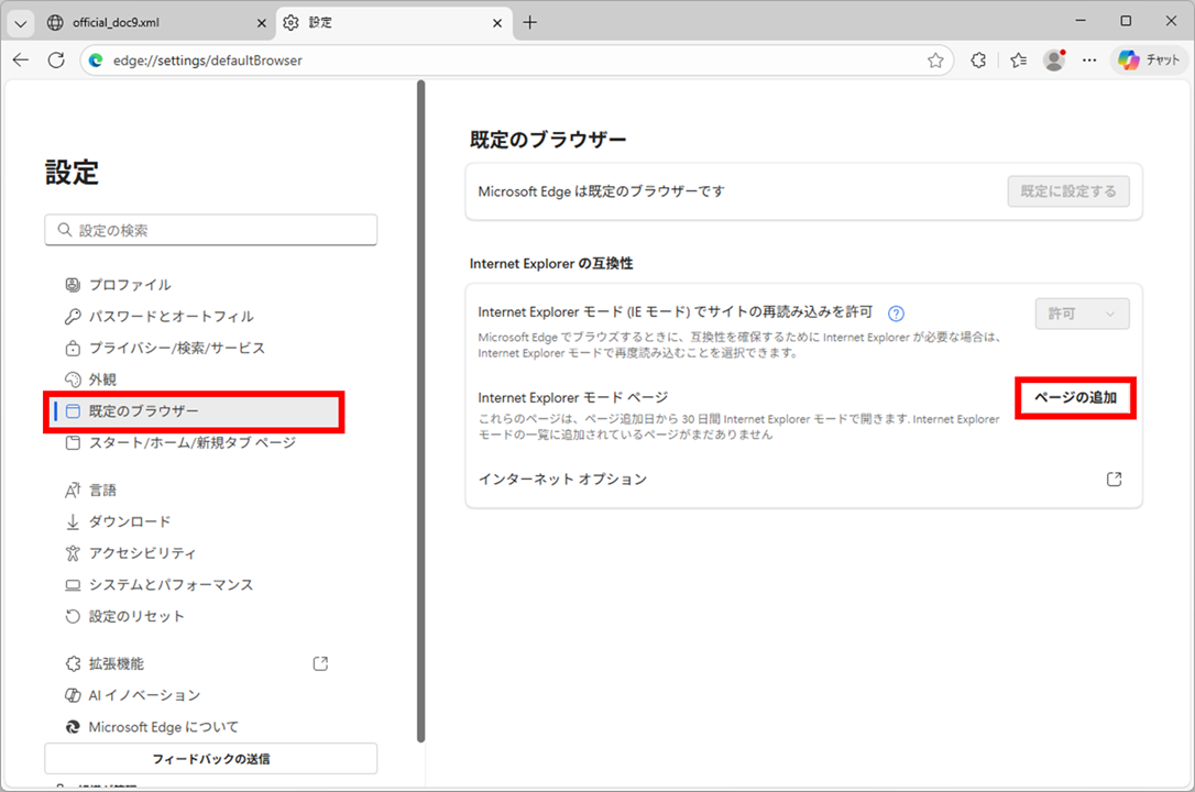「Internet Explorer の互換性メニュー」内の「Internet Explorer モード ページ」の右に表示されている[ページの追加]をクリックします。