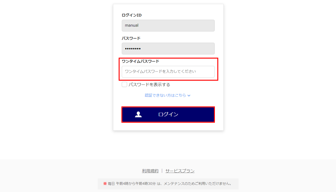 ログインID、パスワードを入力後に[ログイン]をクリックすると、「ワンタイムパスワード」項目が表示されます。