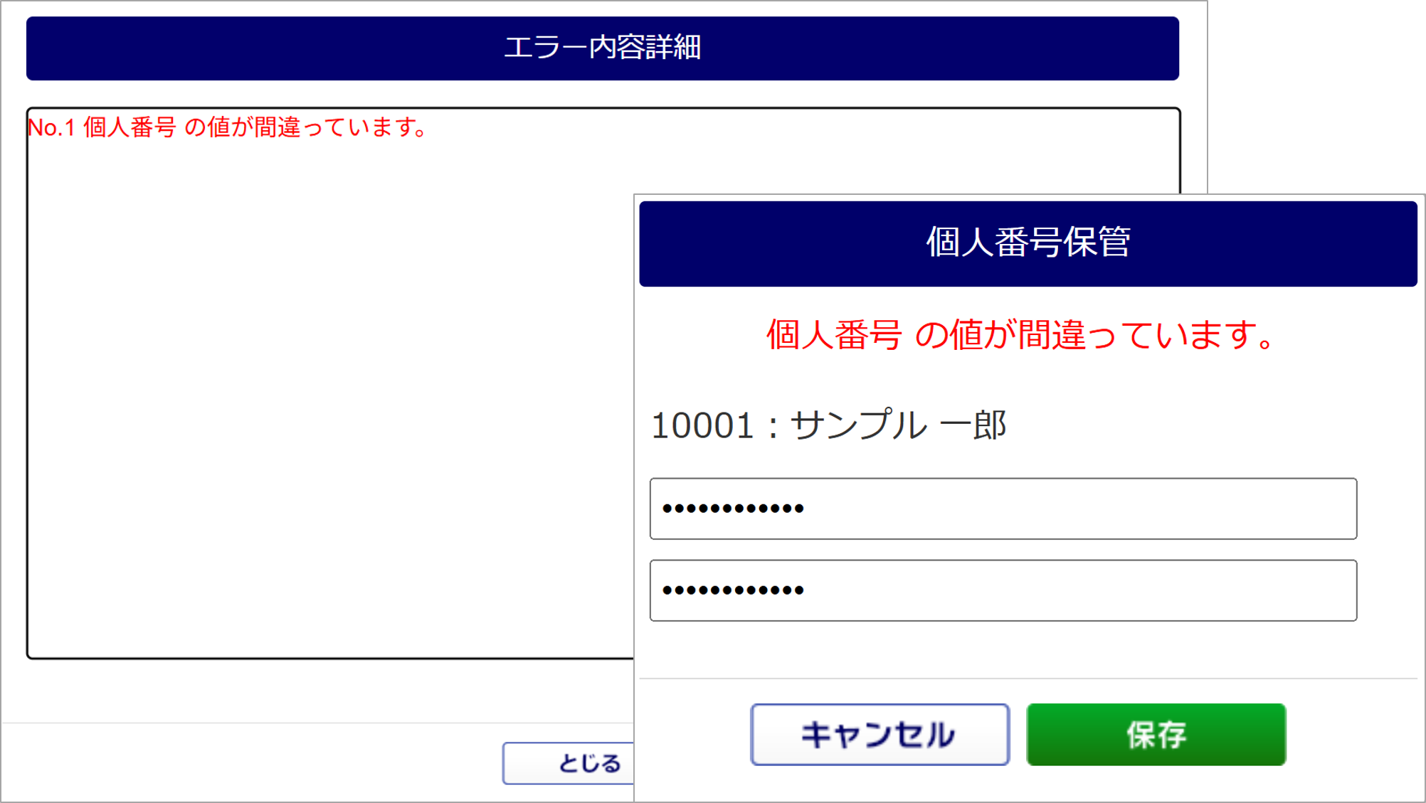 個人番号(マイナンバー)登録時、「個人番号 の値が間違っています。」とエラーメッセージが表示される場合、入力内容に誤りがあります。