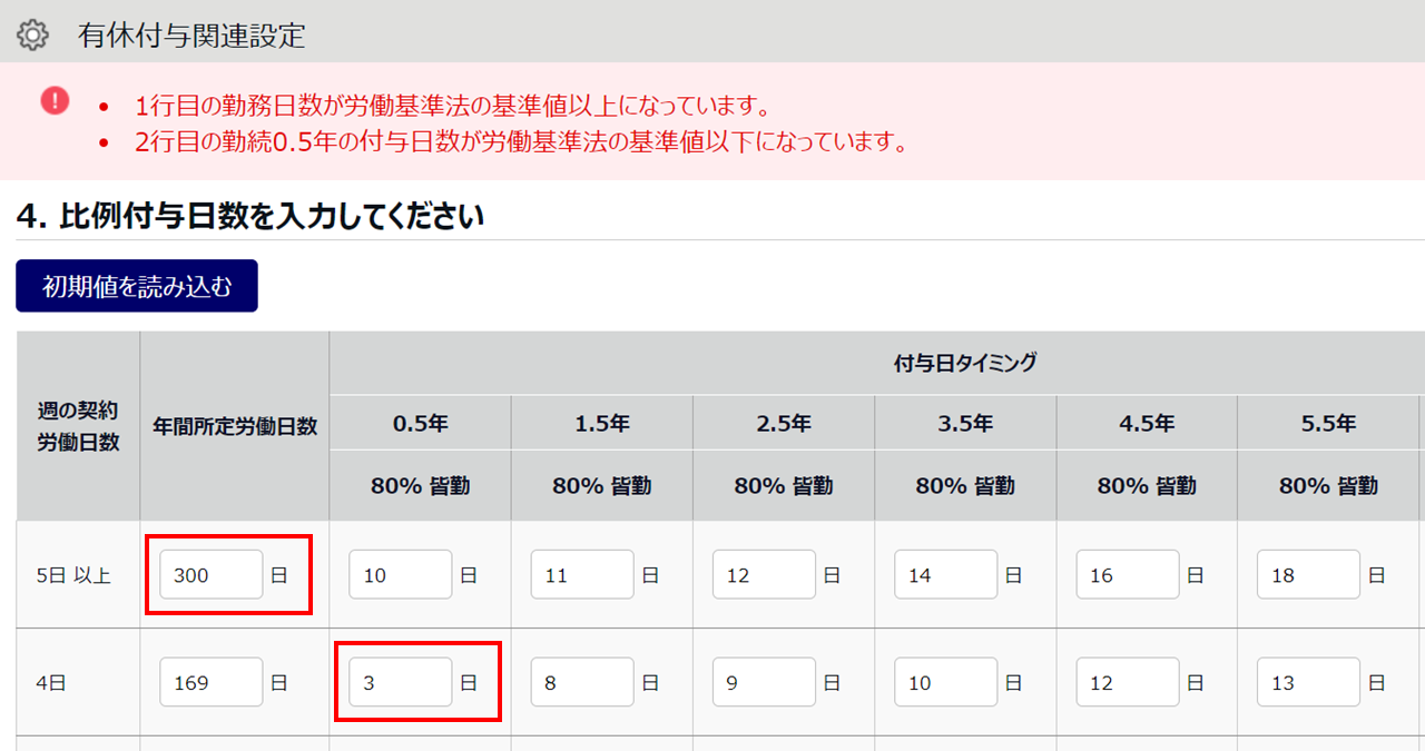 「年間所定労働日数」を労働基準法の基準値以上、または「比例付与日数」を労働基準法の基準値以下に設定すると、エラーになります。