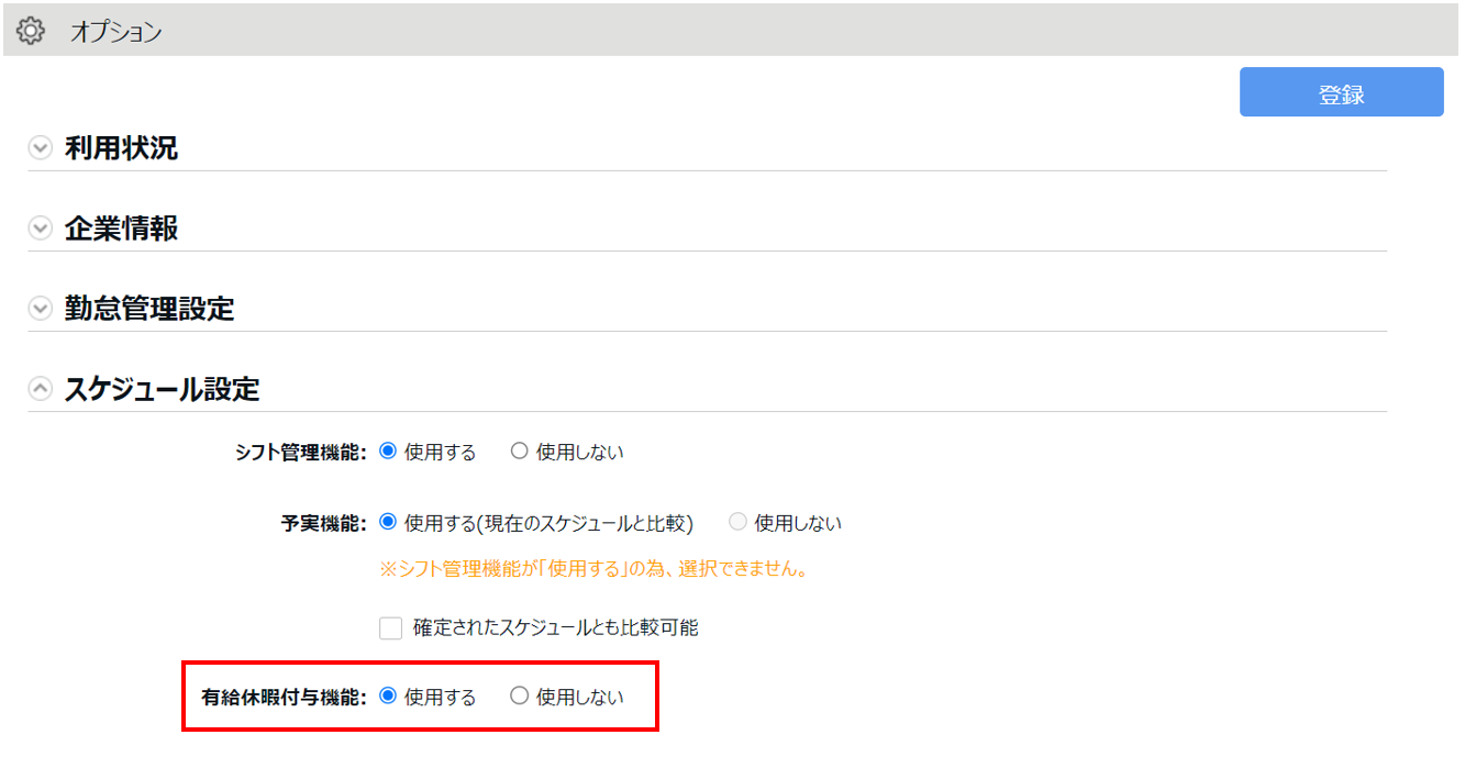 2.「スケジュール設定」カテゴリ内「有給休暇付与機能」項目が「使用する」となっていることを確認します。