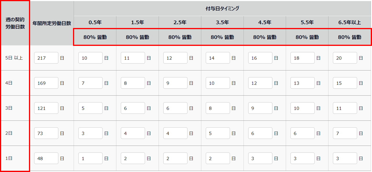 週の契約労働日数に対応する比例付与日数テーブルから付与日数を決定します。