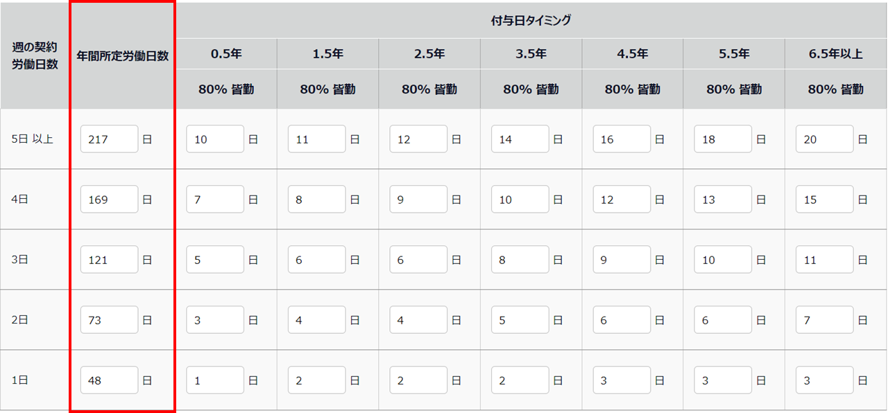 従業員の年間勤務日数に応じて週の契約労働日数を仮定し、有休付与日数を計算します。