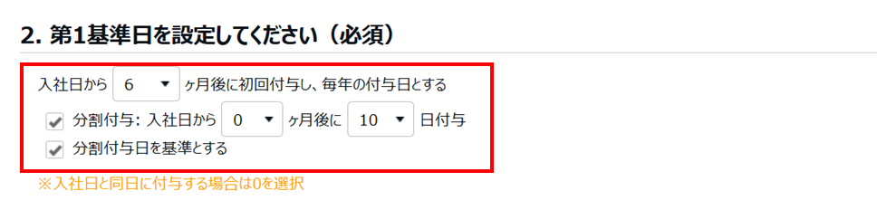 「入社から6ヶ月後に初回付与し、毎年の付与日とする」と設定します。その下の項目2ヶ所にチェックを入れます。