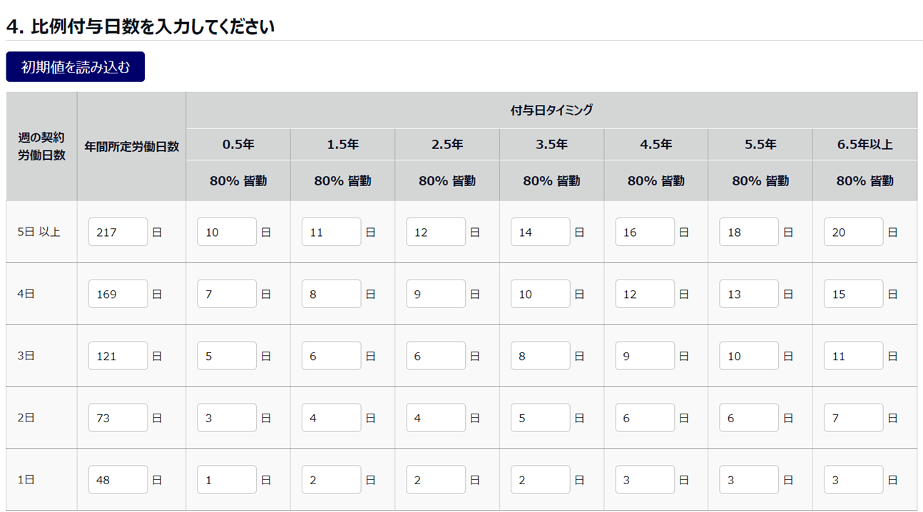 週の契約労働日数と勤続年数に応じた付与日数表を入力します。[初期値を読み込む]をクリックすると、法定基準が入力されますが、貴社の就業ルールに合わせて編集してください。
