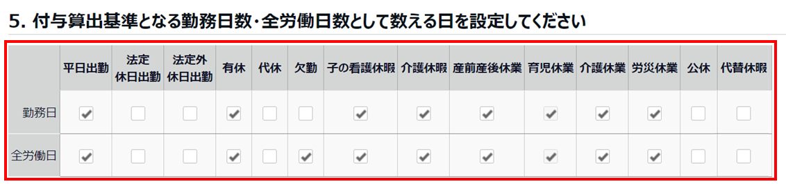5. 付与算出基準となる勤務日数・全労働日数として数える日を設定してください