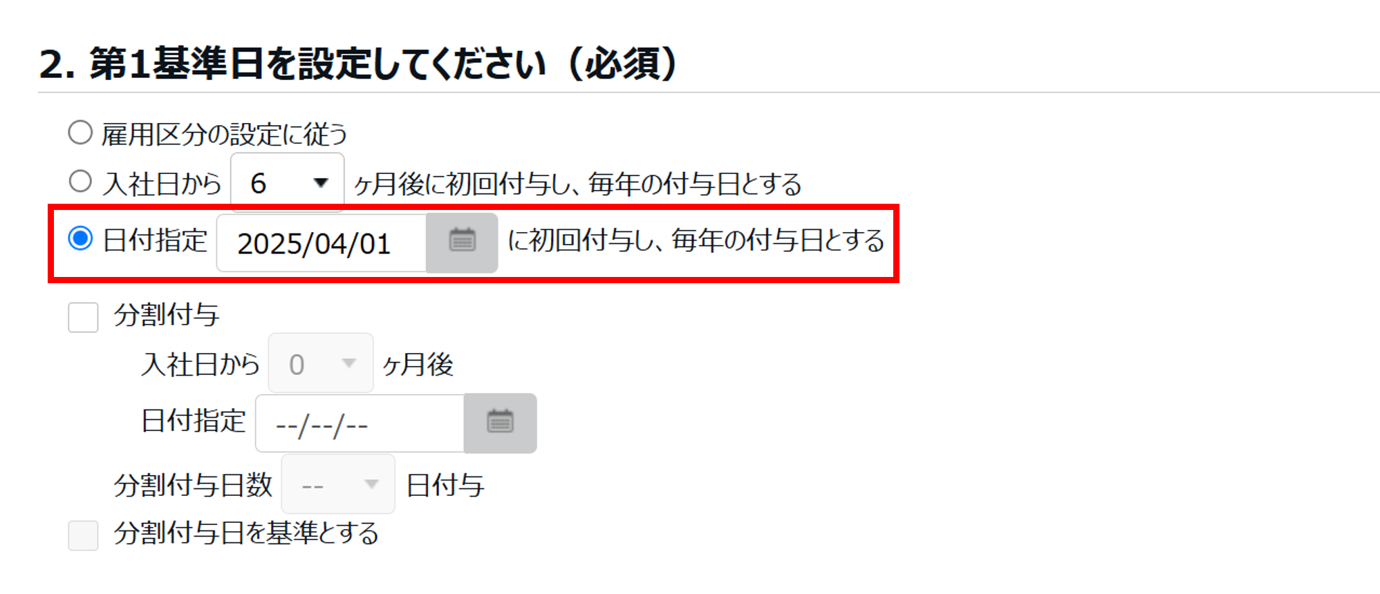 ※「従業員別有休付与設定機能」を現在ご利用中の場合も、「初回付与日、分割付与日の日付指定を使用する」の機能追加が必要です。