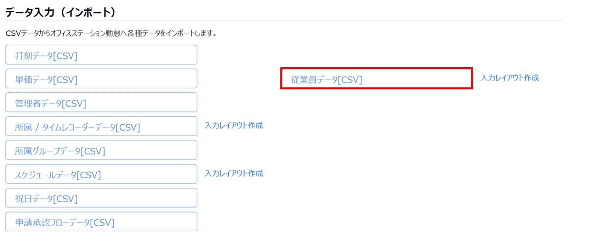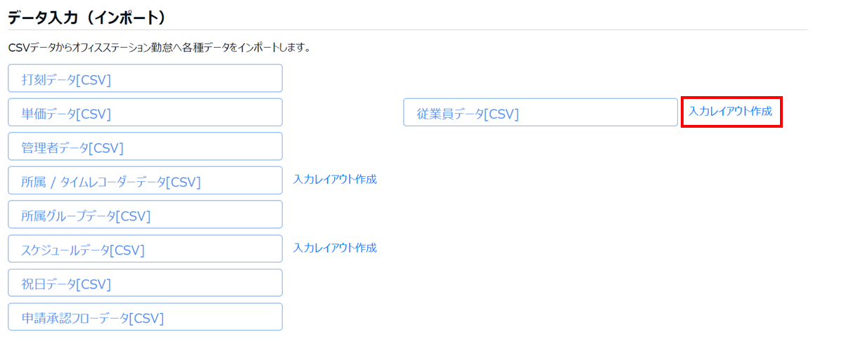 「データ入力(インポート)」カテゴリ内[従業員データ[CSV]]右の「入力レイアウト作成」をクリックします。