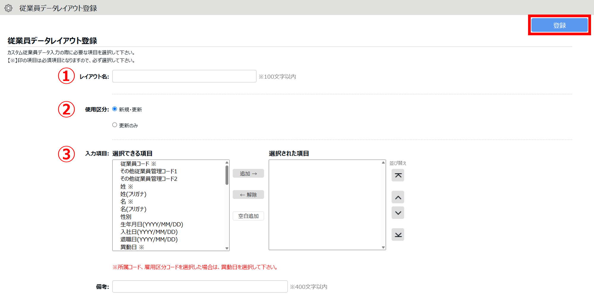 | ③ | 入力項目 | 以下の3項目を選択します。 ・従業員コード ・入社日(YYYY/MM/DD) ・年次有休:初回付与日(YYYY/MM/DD) ※各従業員の「入社日」をすでに登録済みの場合は、レイアウトへの追加は不要です。 |