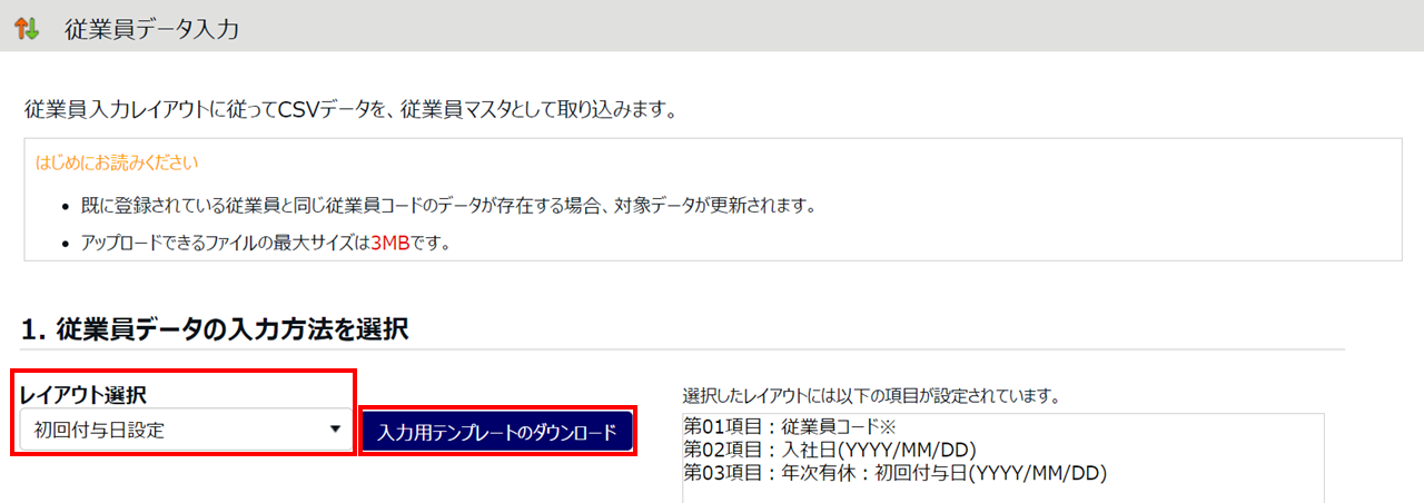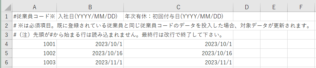 従業員ごとに「入社日」や「初回付与の日付」をインポートする方法を説明します。