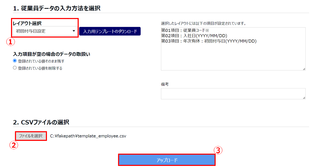 用意したCSVデータを選択して、[アップロード](③)をクリックします。