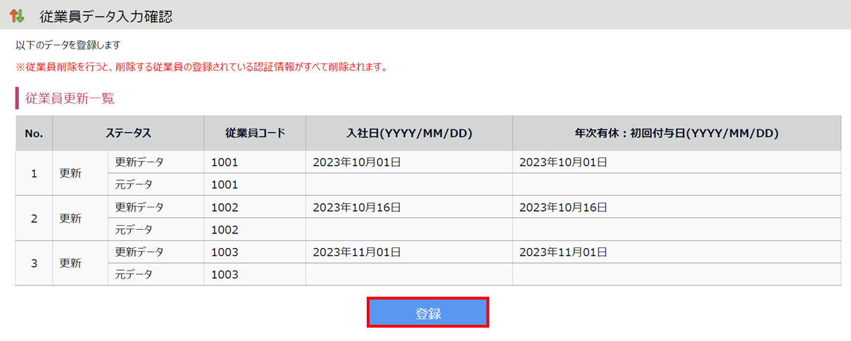 3.「従業員データ入力確認」画面が表示されます。確認後、[登録]をクリックします。インポートを開始します。