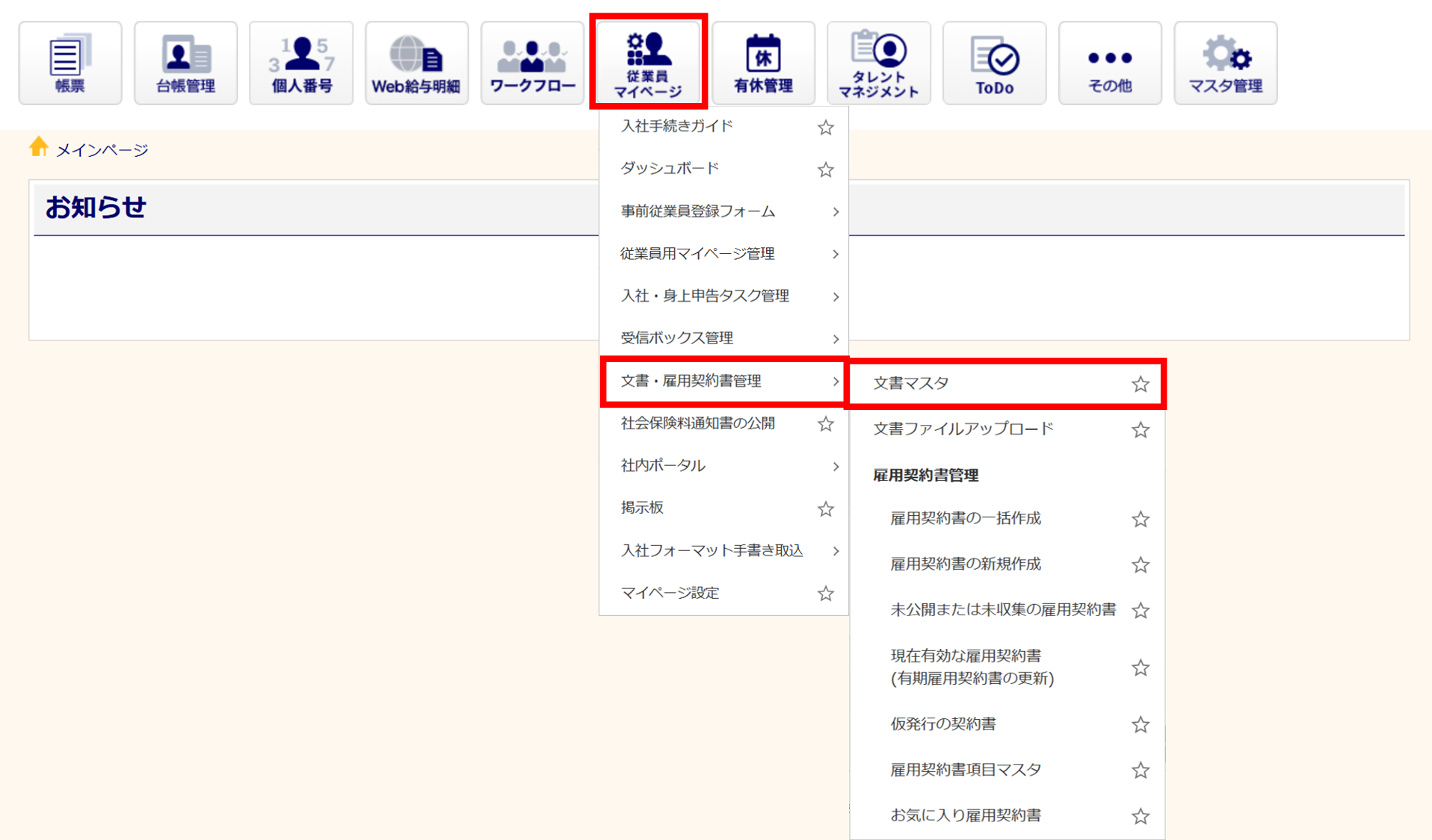 [従業員マイページ]>[文書・雇用契約書管理]>[文書マスタ]をクリックします。