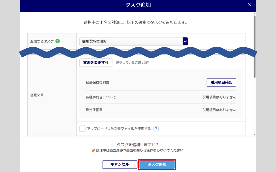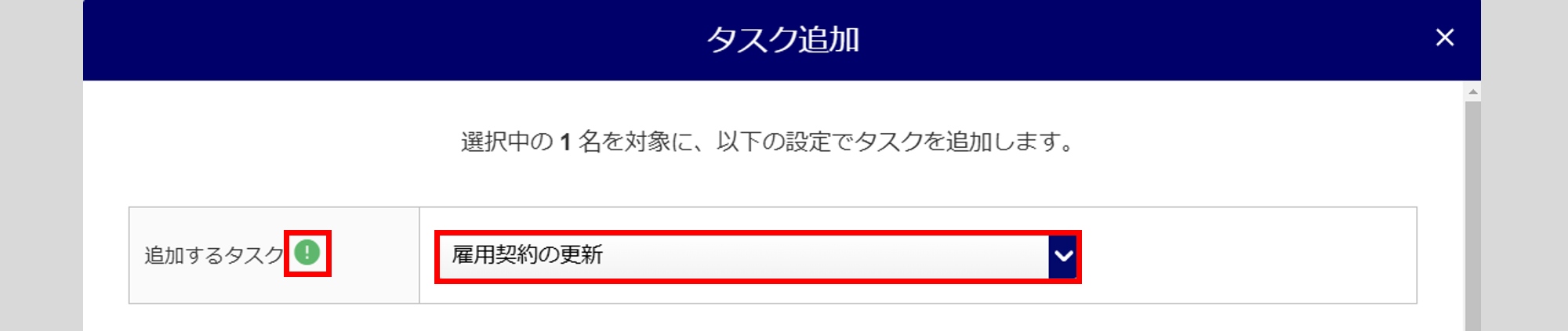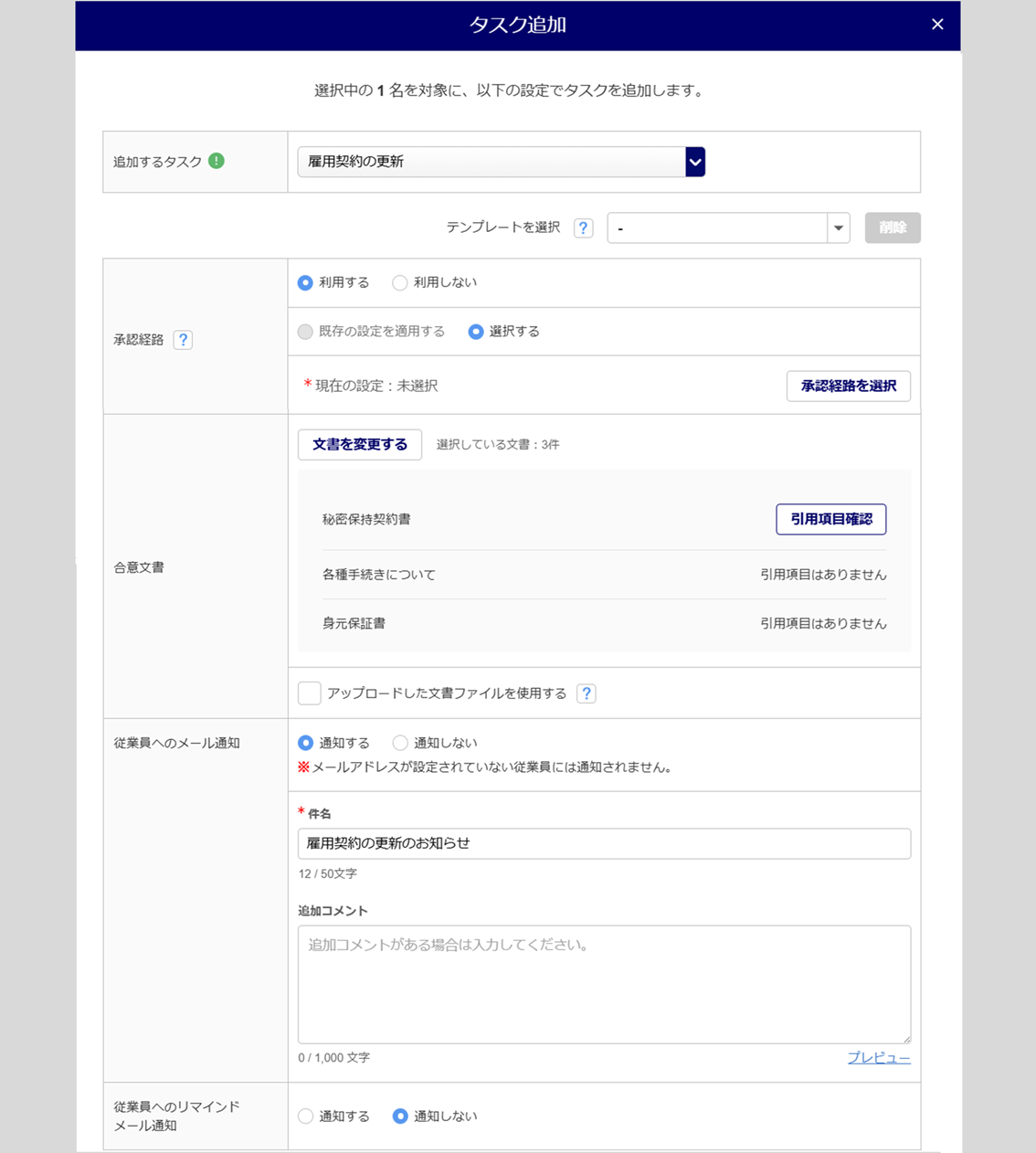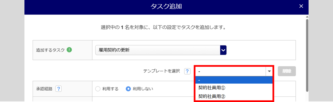 「追加するタスク」に、「雇用契約の更新」を選択します。