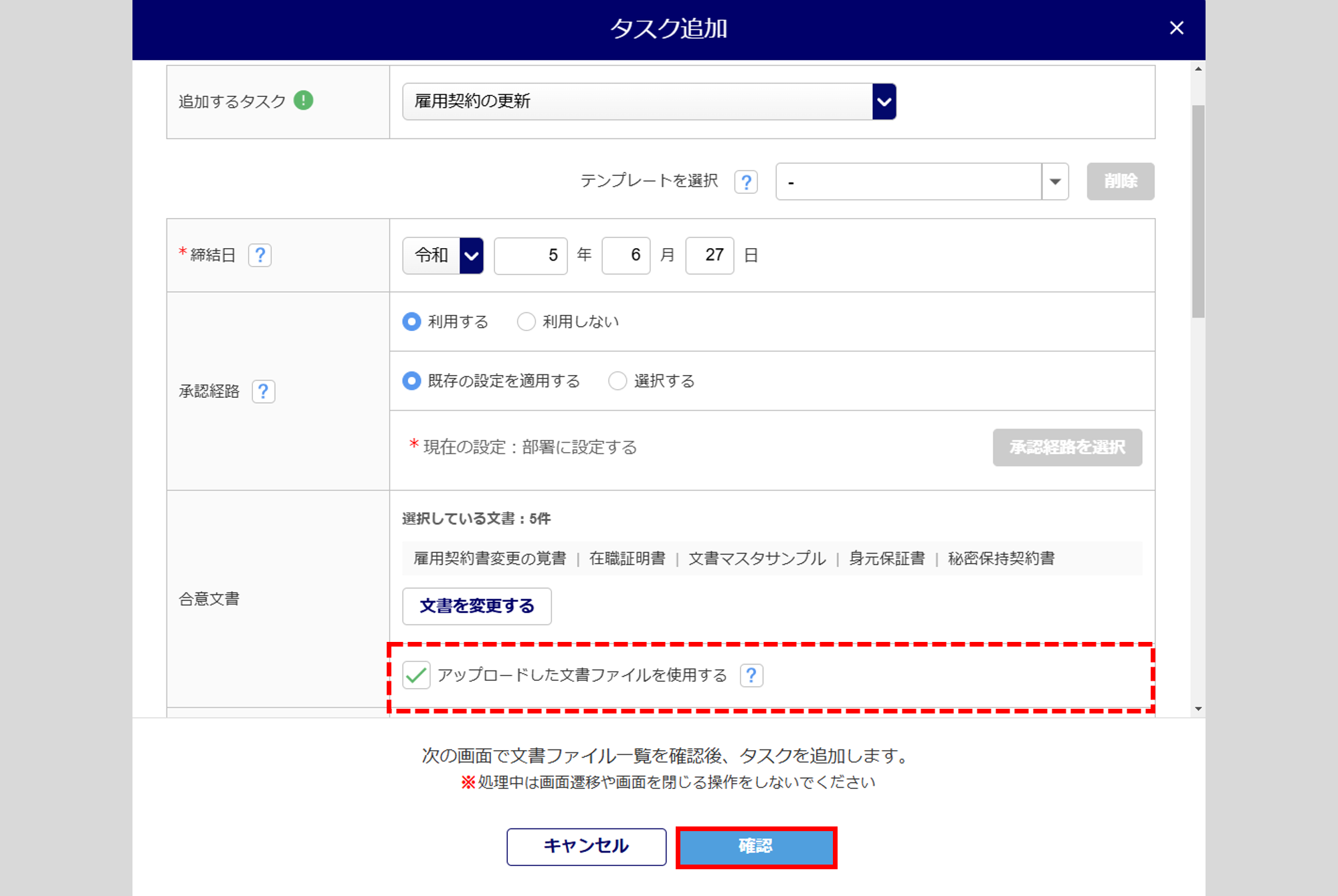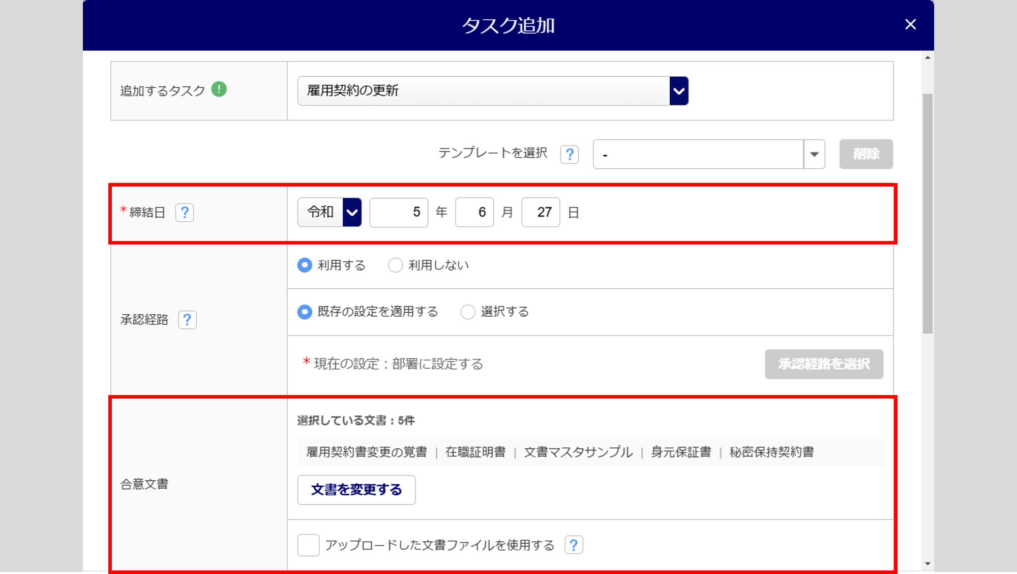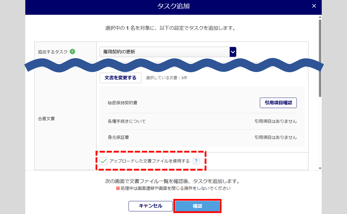 「追加するタスク」に、「雇用契約の更新」を選択します。