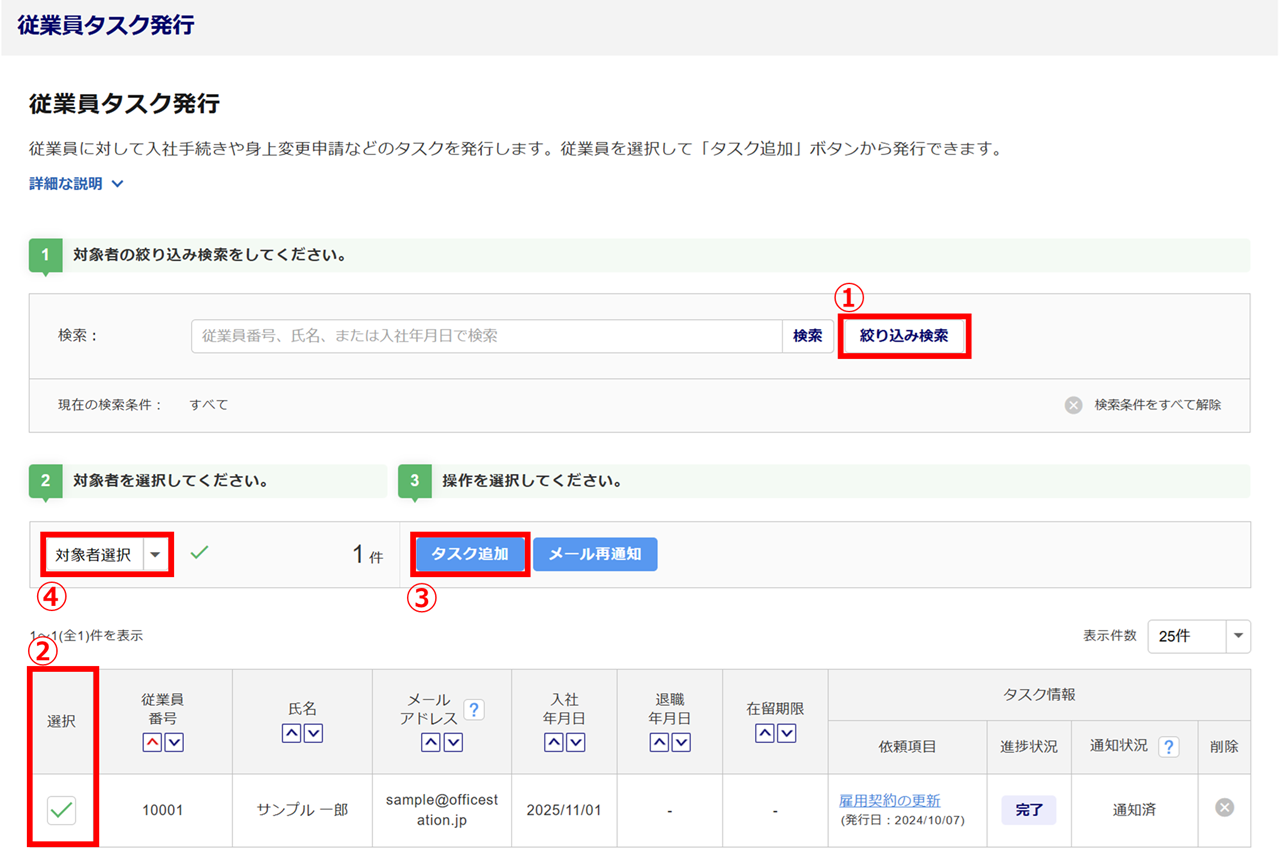 対象従業員の「選択」列(②)にチェックをつけ、[タスク追加](③)をクリックします。