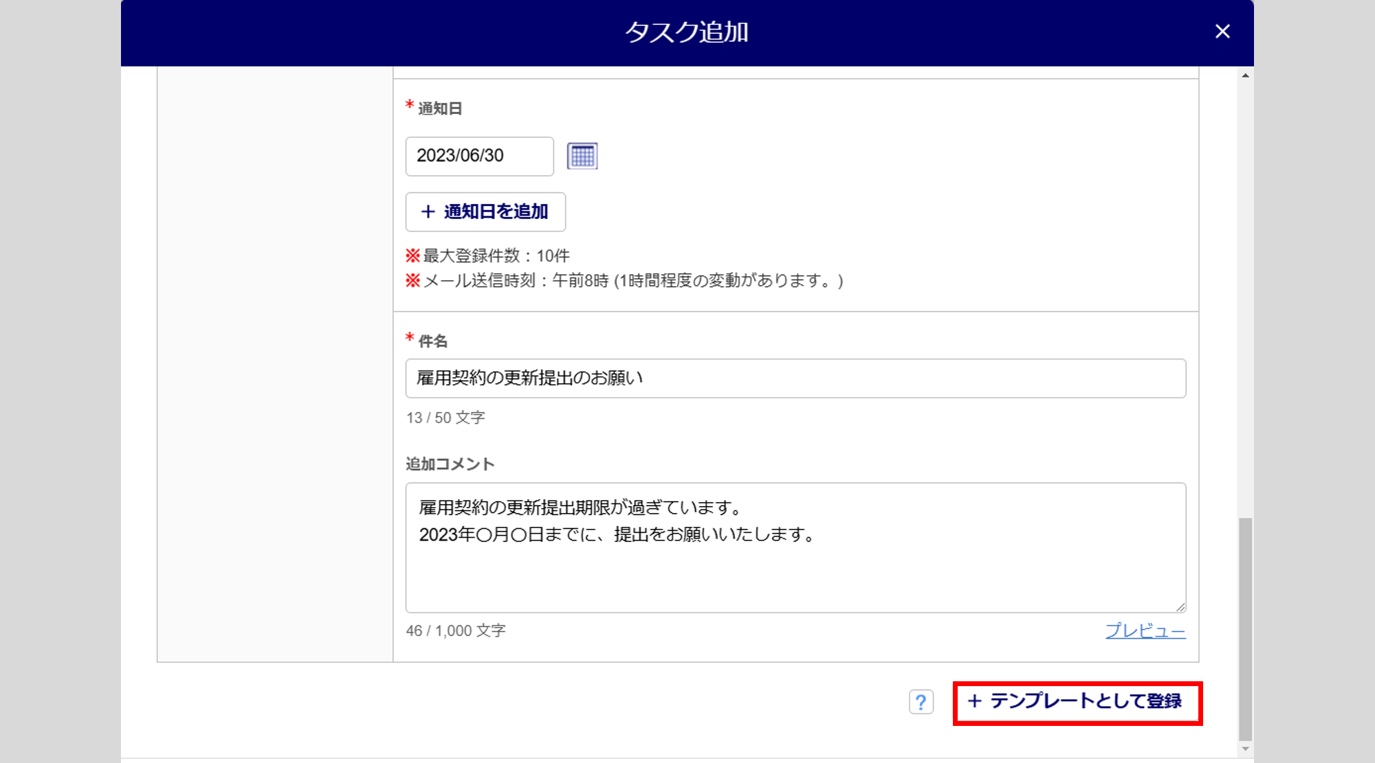 入力した内容をテンプレートとして登録する場合は、[+テンプレートとして保存]をクリックします。