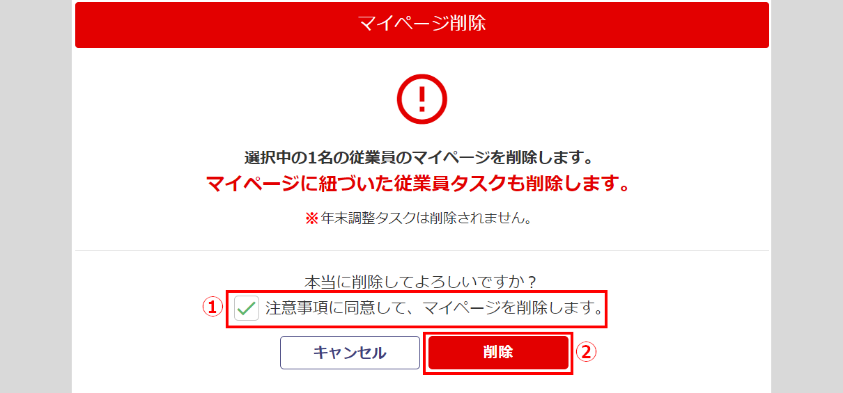 従業員マイページの削除をおこなうと、従業員に発行したタスク情報(年末調整タスクは除く)も削除されます。