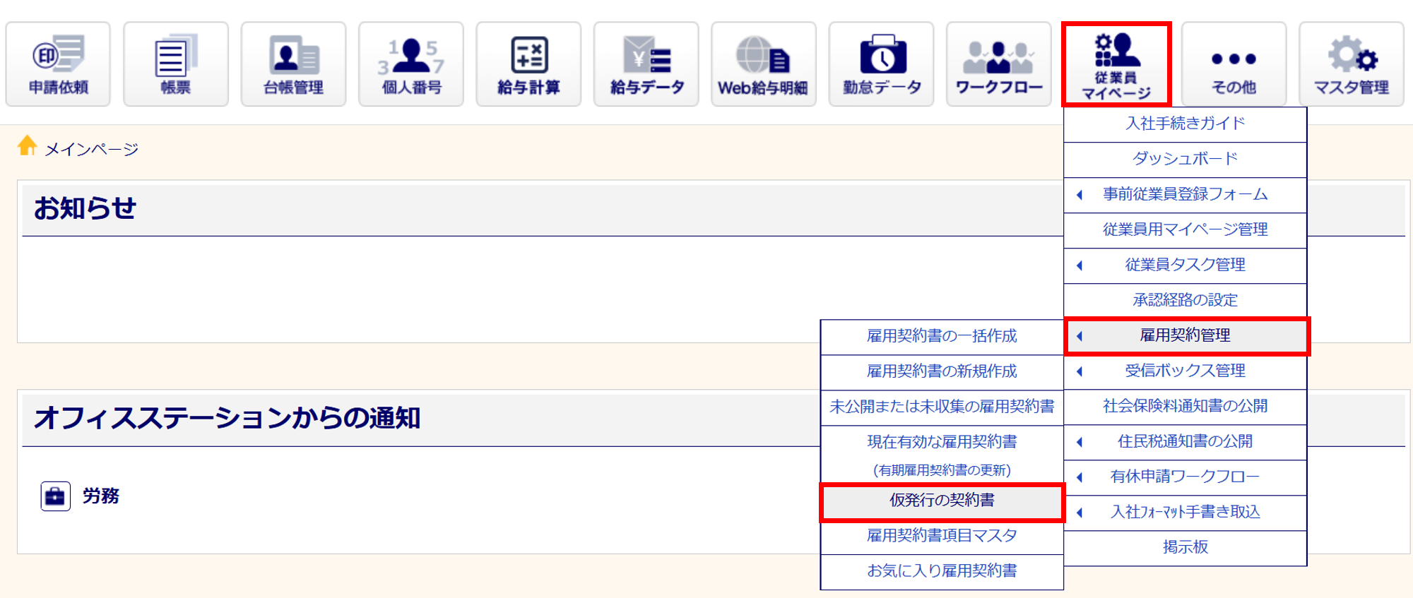 オフィスステーション内に事前に雇用契約書のみを作成する機能になります。