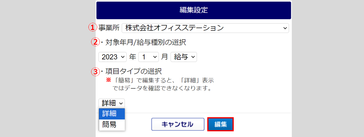 | ③ | 項目タイプの選択 | 「詳細」「簡易」を選択します。 |