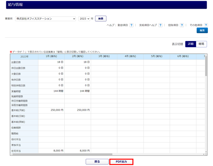 画面最下部の[PDF出力]をクリックすると、選択している従業員の賃金台帳を出力できます。