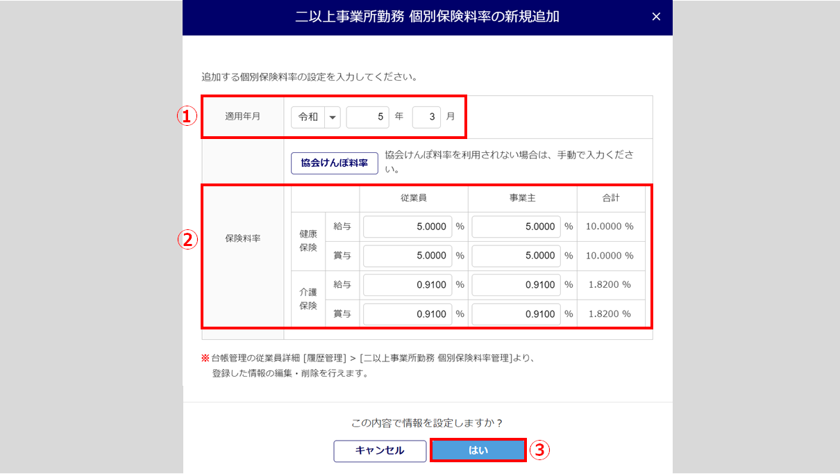 「適用年月」(①)を設定し、「保険料率」(②)を入力します。[はい](③)をクリックします。