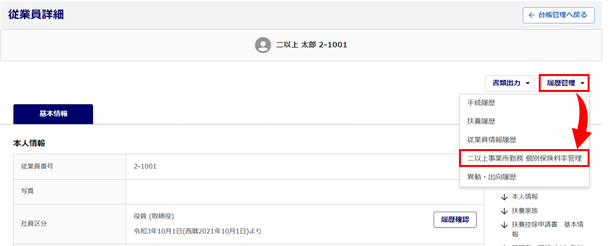 対象従業員の「従業員詳細」画面を開き、[履歴管理]>[二以上事業所勤務 個別保険料率管理]をクリックします。