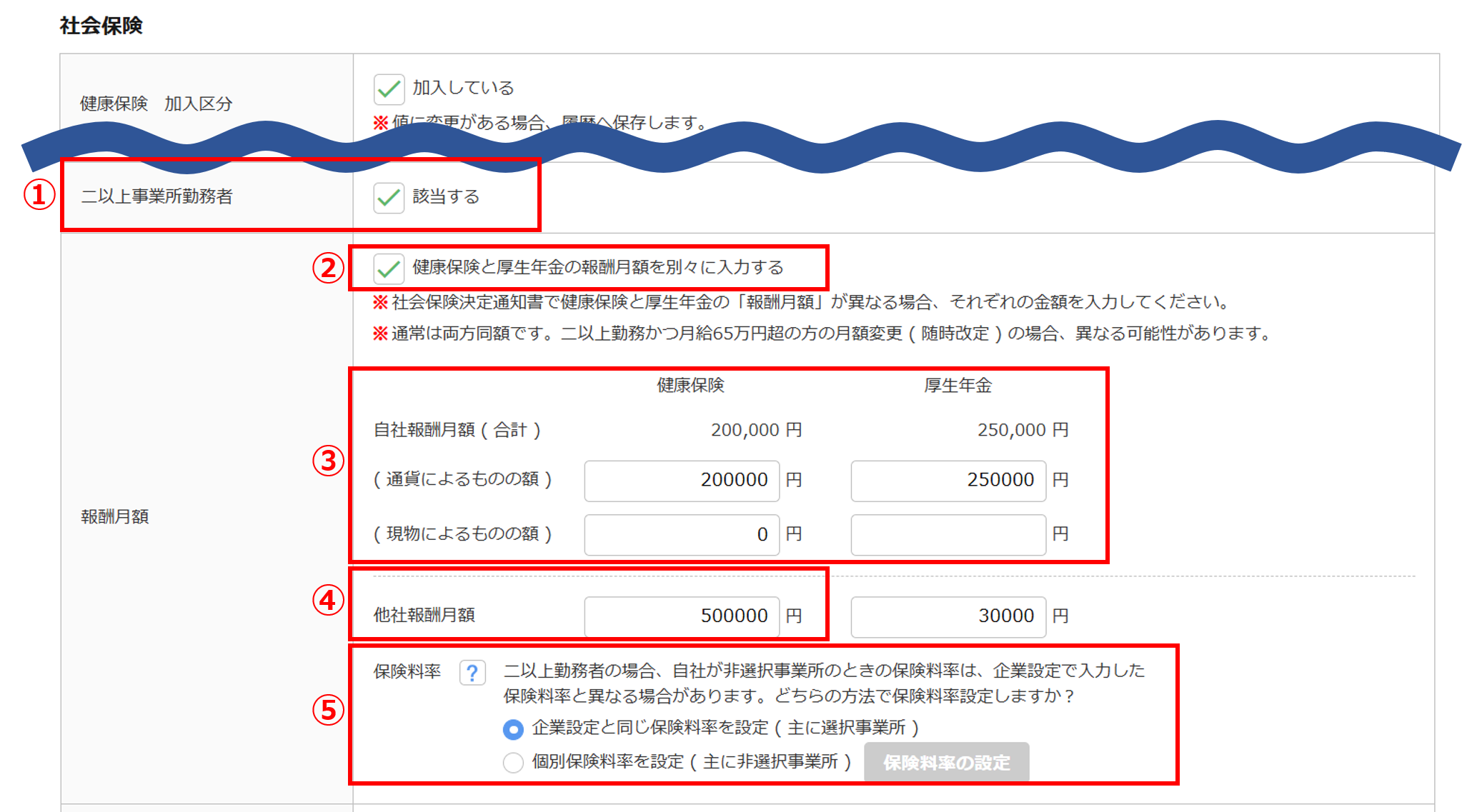 「社会保険」カテゴリの「二以上事業所勤務者」などを設定します。