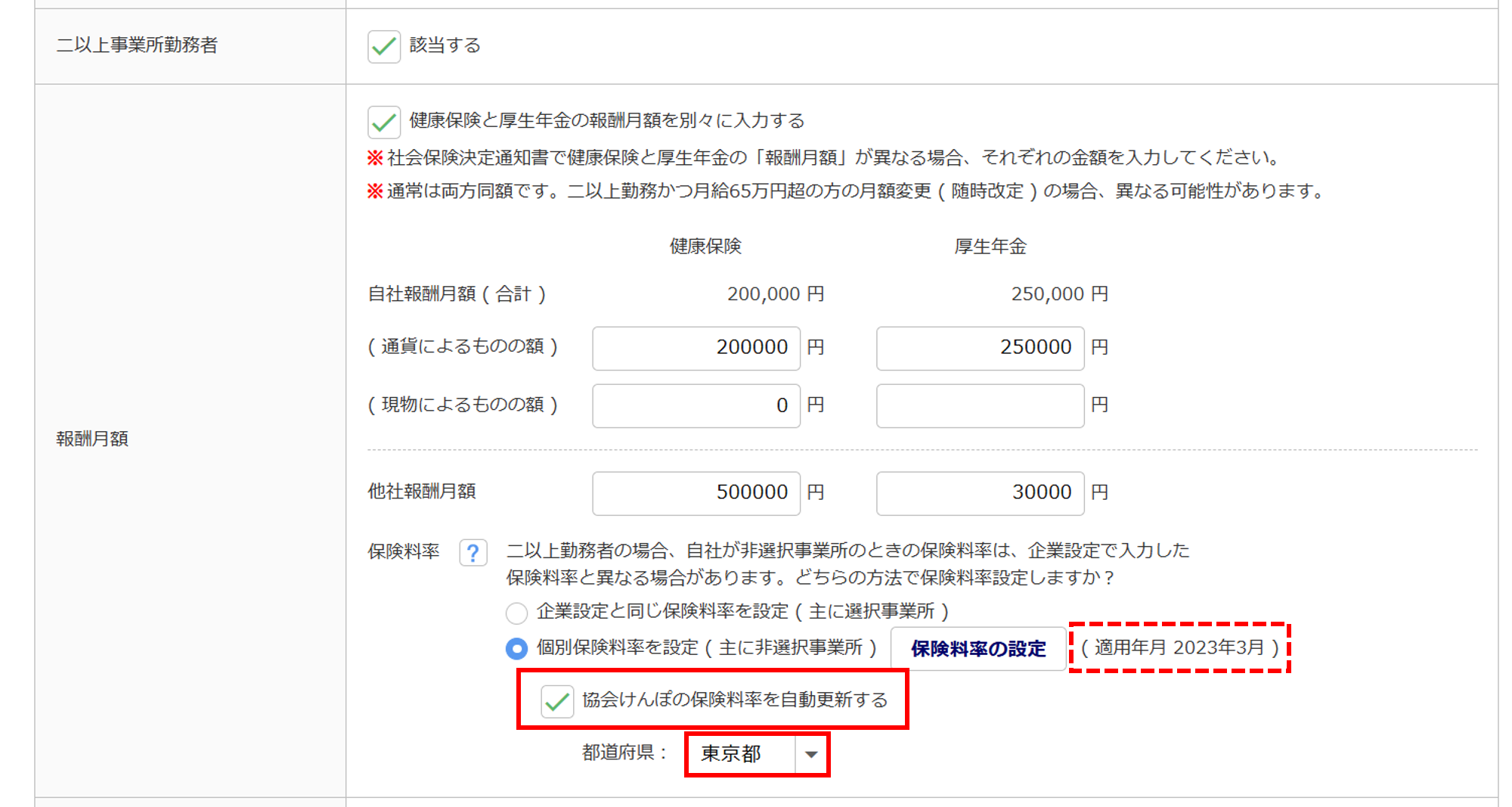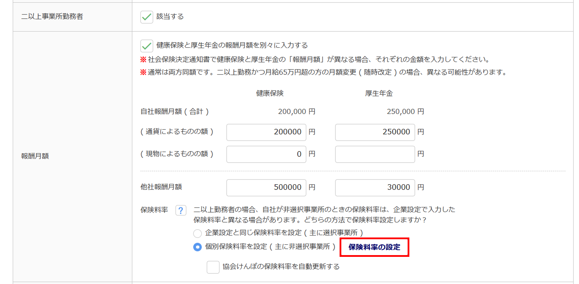 保険料率の設定で、二以上事業所勤務者としての設定は完了です。