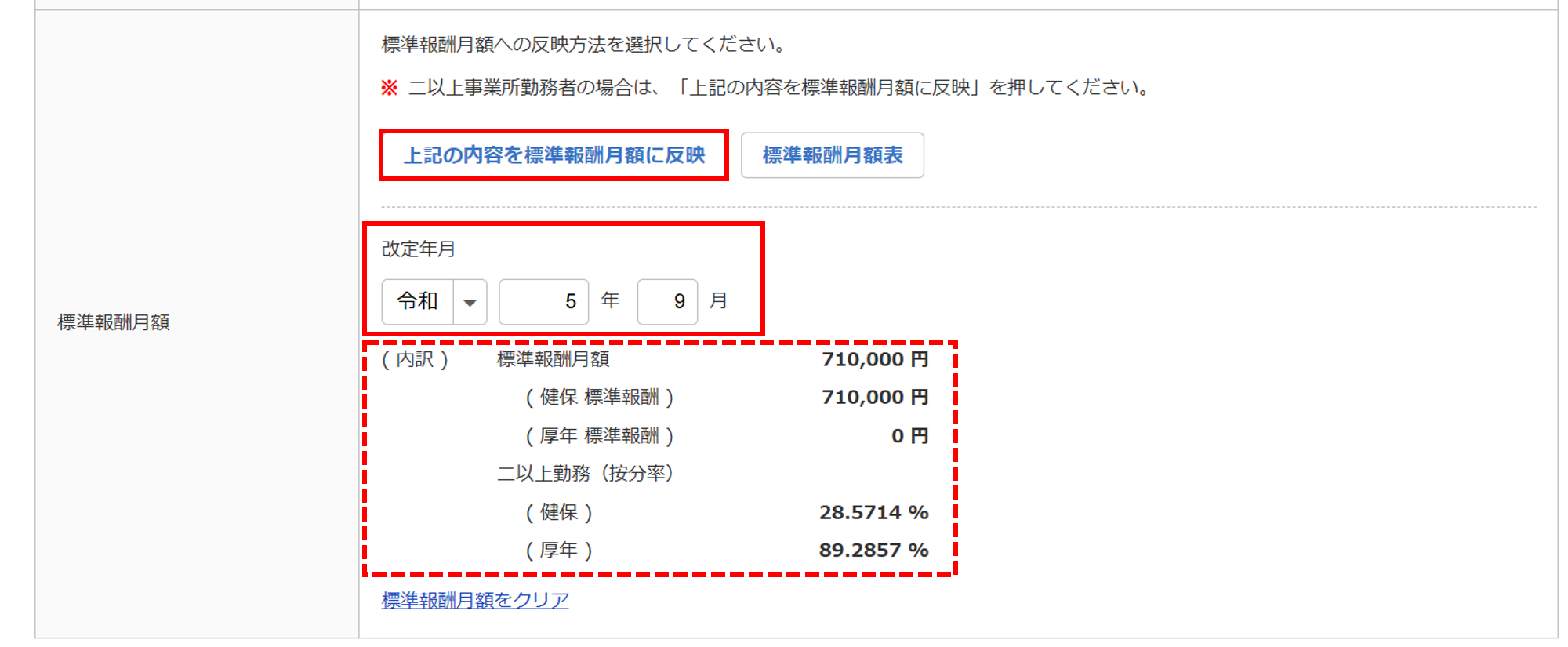 [上記の内容を標準報酬月額に反映]をクリックすることで、「報酬月額」で入力した「自社報酬月額」「他社報酬月額」の情報を基に「(内訳)」を反映することができます。